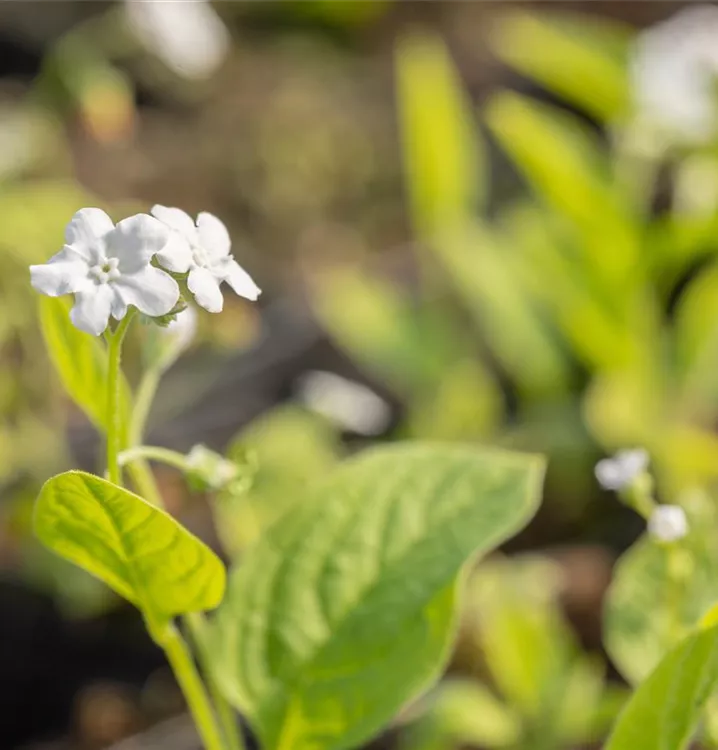 Omphalodes verna 'Alba' bildet in Trauben angeordnete, weiße Blüten ab März.
