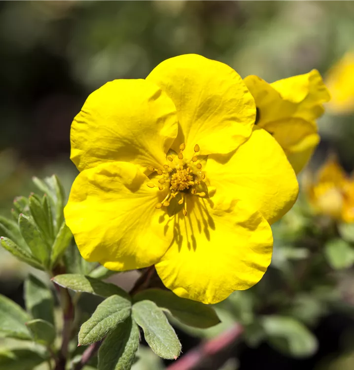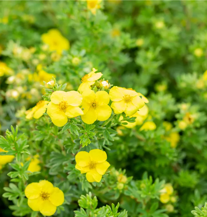 Der Fingerstrauch 'Goldteppich' (Potentilla fruticosa) ist ein buschiger, breiter Zwergstrauch, der gelbe, schalenförmige Blüten hervorbringt. Sie erscheinen von Mai bis Oktober. Zudem trägt der Fingerstrauch 'Goldteppich', gefingerte, dunkelgrüne Blätter. An einem sonnigen bis halbschattigen Standort mit durchlässigem, nährstoffreichem, schwachsaurem Boden erreicht er gewöhnlich eine Höhe von ca. 70 cm und wird ca. 1 m breit.