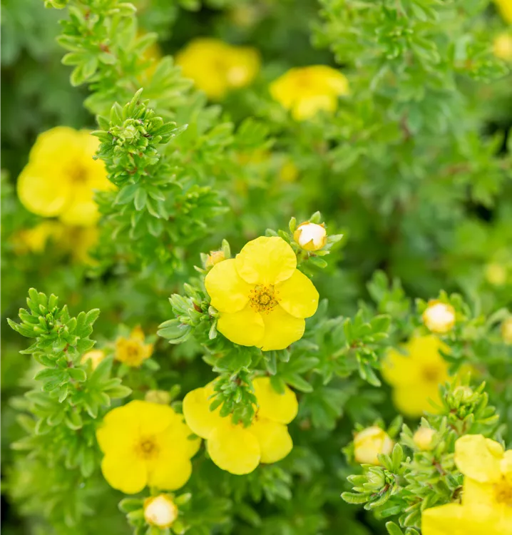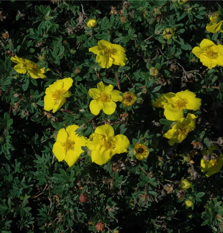 Fingerstrauch 'Goldteppich' ist ein buschig und breit wachsender Zwergstrauch. Er erreicht gewöhnlich eine Höhe von 40 - 70 cm und wird ca. 0,8 - 1 m breit.
