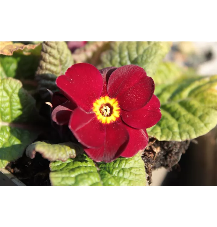 Die Teppich-Primel 'Wanda' (Primula 'Wanda') bildet purpurrote, ansehnliche Blüten von März bis Mai. Die Blüten sind schalenförmig.