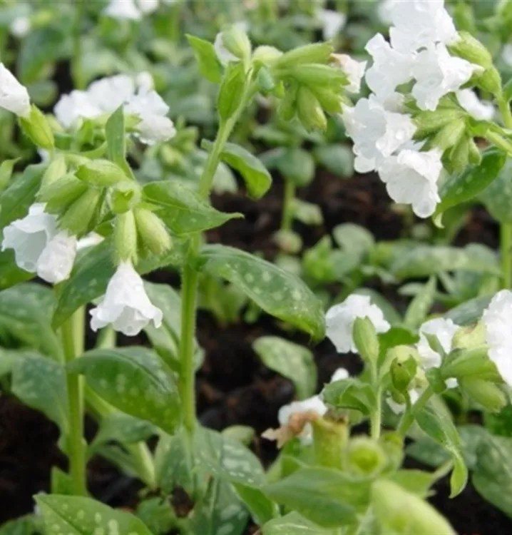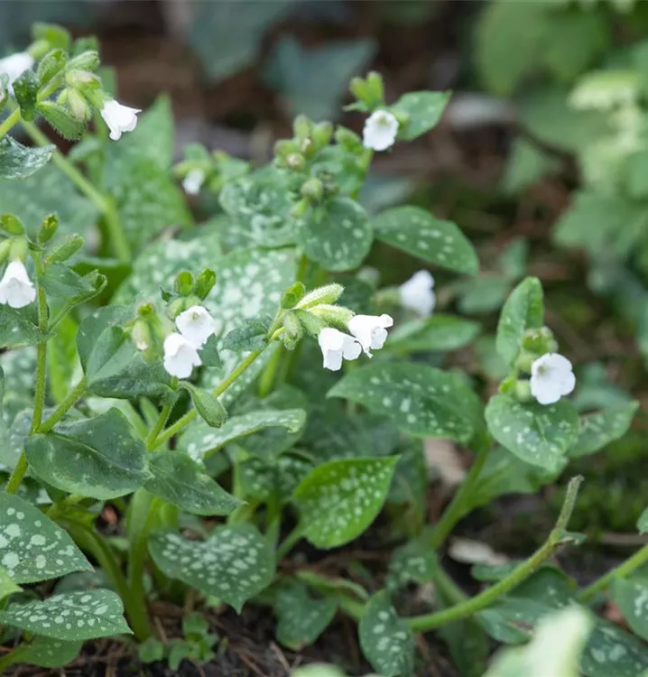 Pulmonaria officinalis ist eine sommergrüne, niedrig wachsende Staude mit dunkelgrünen, silbergrau gefleckten Blättern. Ab März bilden sich Blüten. Die sind bei dieser Sorte reinweiß. Nach der Blüte kann ein Rückschnitt erfolgen, um einen frischen Neuaustrieb zu fördern.
