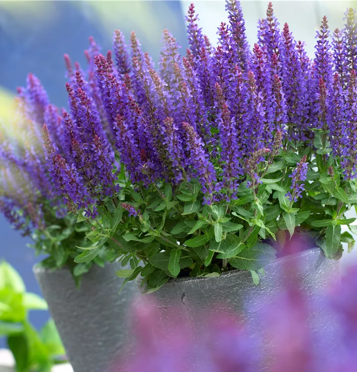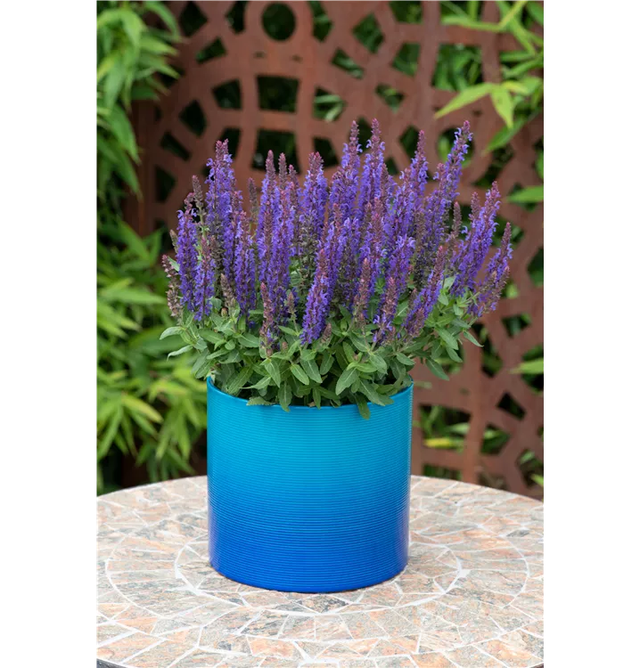 Der Steppen-Salbei 'Compact Deep Blue' ist eine neue Sorte aus der 'Sensation -R-'-Serie, die äußerst kompakte Sorten hervorgebracht hat. 'Compact Deep Blue' blüht kräftig violettblau und wird mit Blüte nur etwa 30cm hoch. Besonders gut für Kübelpflanzungen oder den Beetvordergrund geeignet.