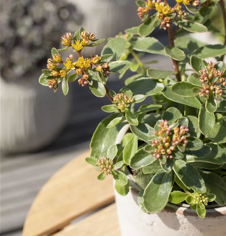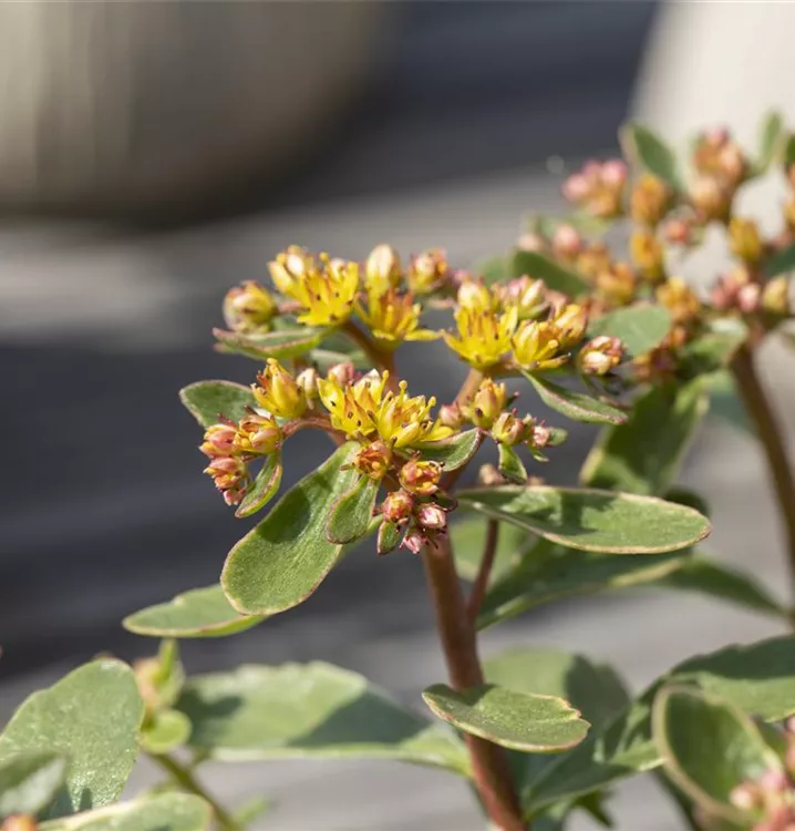 Die Blätter des Buntlaubigen Garten-Fettblatts sind dunkelgrün und haben einen creme-orangefarbenen Rand. Passend dazu erscheinen ab Juni viele kleine, orangegelbe Blüten, die aussehen wie kleine Sterne. Ein trockener, durchlässiger Boden mit ganztägigem Sonnenschein ist der ideale Standort für diese kleinbleibende Sukkulente. Bei Staunässe reagiert sie mit Laubabwurf und verfaulenden Wurzeln, ist aber ansonsten absolut pflegeleicht.