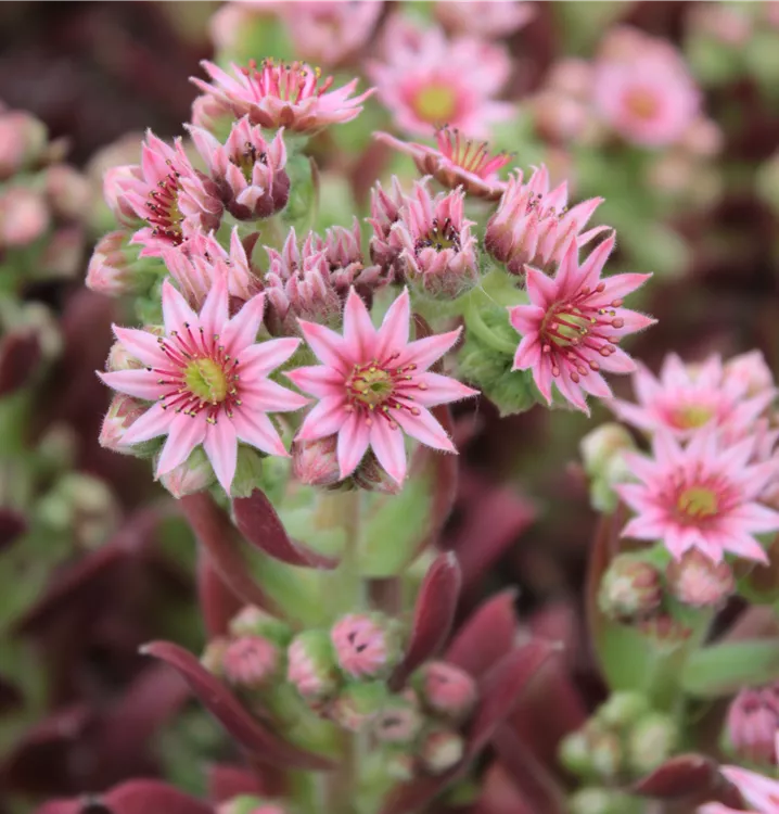 Von Juni bis Juli schieben sich aus den älteren Rosetten 10-20 cm lange, beblätterte Blütenstängel, deren Enden verzweigt sind und an denen strahlenförmige, zumeist rosafarbene Einzelblüten sitzen. Sie sind übrigens sehr beliebt bei Bienen und Hummeln.