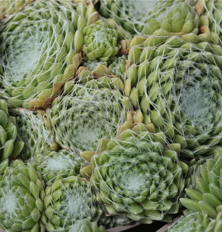 Die Spinnweb-Hauswurz (Sempervivum arachnoideum ssp. arachnoideum) kommt vor allem in den Alpen, den Appeninnen und in den Pyrenäen vor. Die kleinen Rosetten werden nur 0,5-2,5 cm groß. Die Blattseiten sind mit feinen Härchen bewimpert und die Blattspitzen braunrot gefärbt.