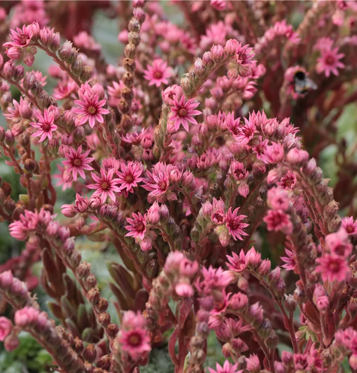 Von Juni bis Juli schieben sich aus den älteren Rosetten 10-20 cm lange, beblätterte Blütenstängel, deren Enden verzweigt sind und an denen strahlenförmige, zumeist rosafarbene Einzelblüten sitzen. Sie sind übrigens sehr beliebt bei Bienen und Hummeln.
