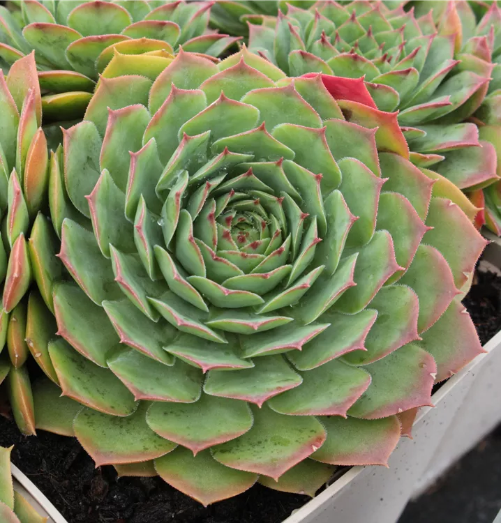 Sempervivum braucht nicht viel, die Wildformen eigentlich nicht einmal Erde. So genügsam sind sie bestens geeignet für pflegeextensive Dachbegrünungen oder um sie in Mauerfugen zu setzen. Und natürlich kann man sie auch in Töpfe oder Schalen pflanzen.
