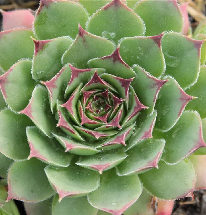 Der Garten-Dachwurz 'Noir' (Sempervivum tectorum 'Noir') hat grüngraues Laub mit braunroten Spitzen. Die Winterfärbung ist tief dunkelbraunrot. (Moore, 1950)