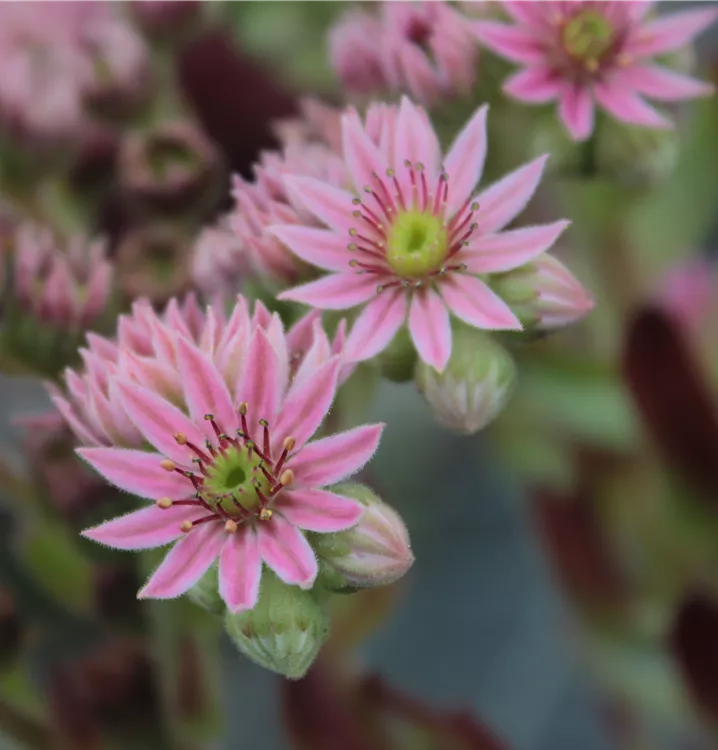 Von Juni bis Juli schieben sich aus den älteren Rosetten 10-20 cm lange, beblätterte Blütenstängel, deren Enden verzweigt sind und an denen strahlenförmige, zumeist rosafarbene Einzelblüten sitzen. Sie sind übrigens sehr beliebt bei Bienen und Hummeln.
