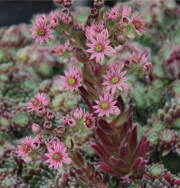 Nach der Blüte stirbt die jeweilige Rosette ab. Sempervivum ist monokarp, das heißt: sie blüht nur ein einziges Mal. Zuvor hat sie jedoch reichlich Tochterrosetten gebildet, die sich ablösen und die Pflanze erhalten.