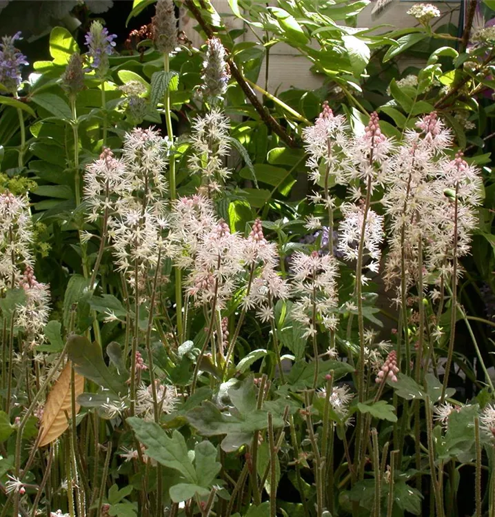 Tiarella laciniata 'Pink Bouquet' bildet in Doldentrauben angeordnete, rosafarbene Blüten ab Mai. Diese verströmen einen angenehmen Duft.
