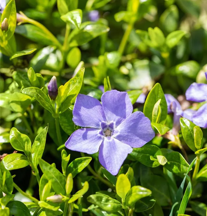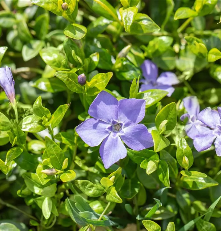 Schluss mit finsteren Ecken! Durch seinen dichten, niederliegenden Wuchs ist das kleinblättrige Immergrün als Bodendecker gut geeignet – selbst an schattigen Orten! Wenn die großen Einzelblüten der Sorte 'Marie' das dunkle Blattgrün durchsetzen, formt sich ein einzigartiges Bild: Die intensivgefärbten Kronen leuchtenden Blaus bilden einen wunderschönen Kontrast zu dem feinblättrigem Laub.
