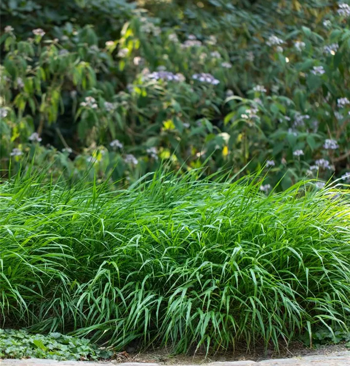 Das Garten-Ziergras 'Greenhills' (Hakonechloa macra) ist mit seiner mittelgrünen Blattfärbung ein dekoratives Gestaltungselement im Garten, welches sich an einem halbschattigen bis schattigen Standort mit einem möglichst durchlässigen, humosen Boden am wohlsten fühlt. Die grünen Blütenwedel schmücken die buschig und rundlich wachsende Pflanze ab Sommer. Bei günstigen Bedingungen erreicht dieses winterharte Gras eine Höhe von ca. 30 cm und wird bis zu 30 cm breit.