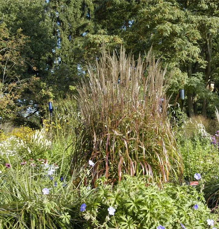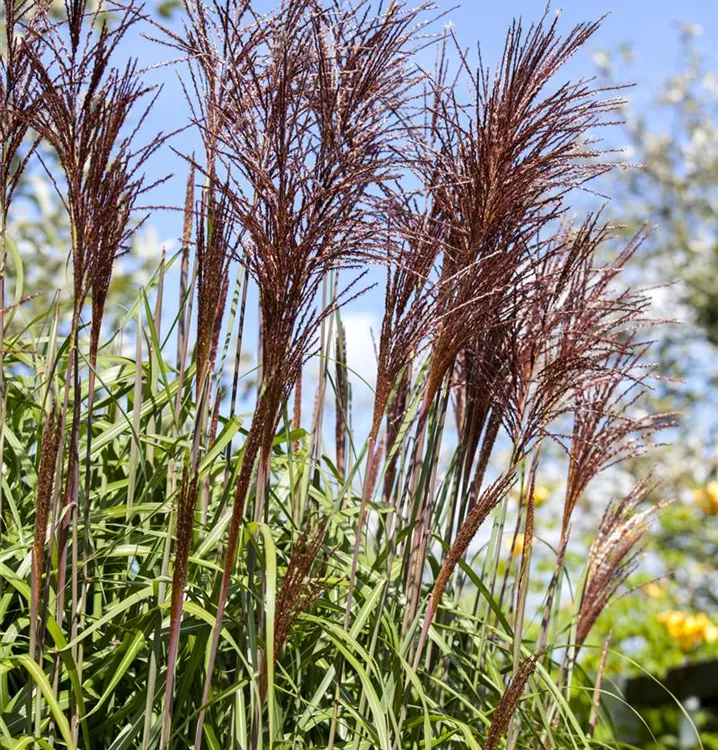Die rot-braunen Blüten des Garten-Chinaschilf 'Ghana' erscheinen in Rispen von September bis Oktober.