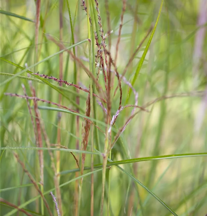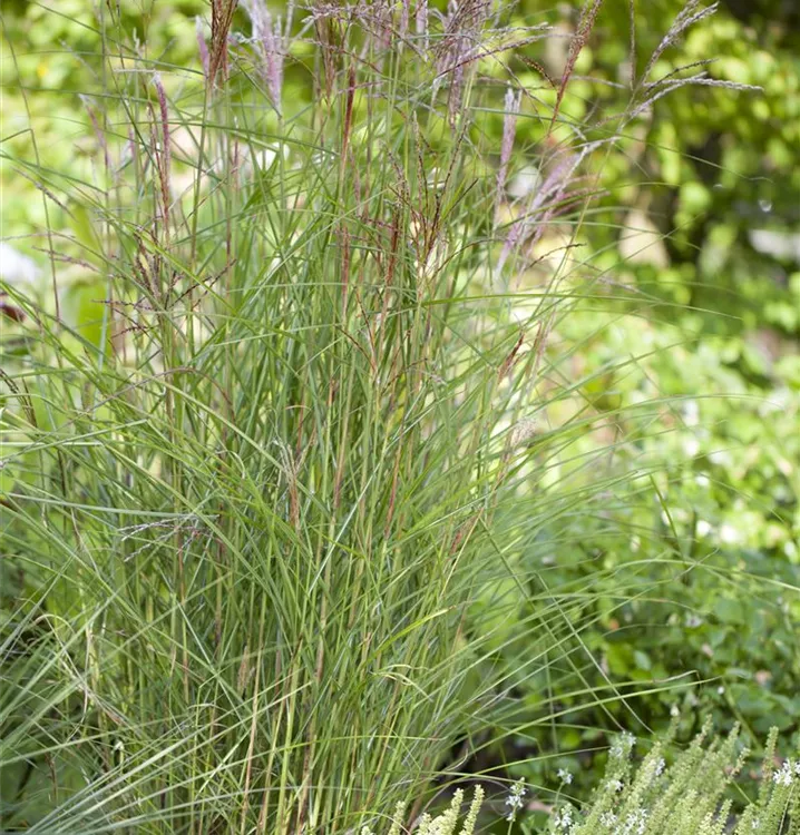 Das Garten-Chinaschilf 'Kleine Fontäne' (Miscanthus sinensis) ist mit seiner mittelgrünen Blattfärbung ein dekoratives Gestaltungselement im Garten, welches sich an einem sonnigen bis halbschattigen Standort mit einem möglichst durchlässigen, humosen, nährstoffreichen Boden am wohlsten fühlt. Die hellrosafarbenen Blütenwedel schmücken die aufrecht wachsende Pflanze ab Sommer. Bei günstigen Bedingungen erreicht dieses winterharte Gras eine Höhe von ca. 1,1 m und wird bis zu 80 cm breit.