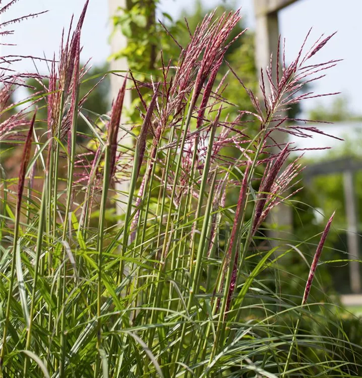 Die rosafarbenen Blüten des Garten-Chinaschilf 'Rotsilber' erscheinen in Rispen von September bis Oktober.