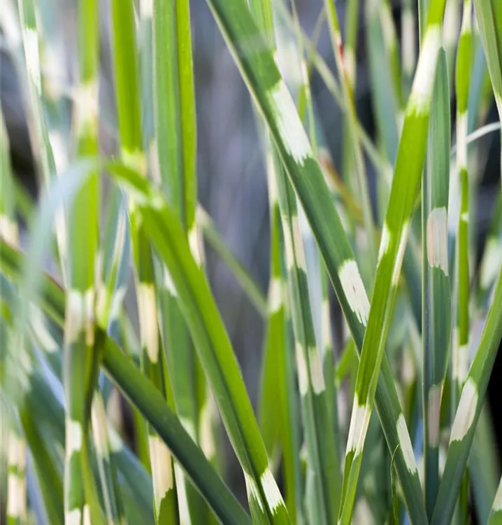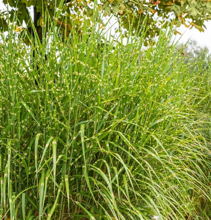Hoher Blattschmuckwert. Die sommergrünen Blätter des Garten-Zebraschilfs sind gelb-grün, lineal.