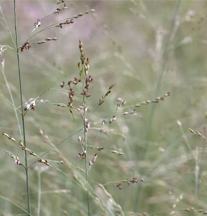 Die weißen Blüten der Garten-Ruten-Hirse 'Prairie Sky' erscheinen in Rispen von August bis Oktober.