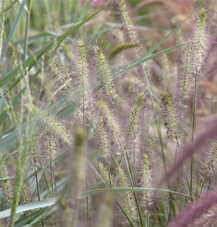 Das Lampenputzergras 'Weserbergland' (Pennisetum alopecuroides 'Weserbergland') ist eine feine und elegante Auslese des klassischen Lampenputzergrases. Die Horste erreicht eine Höhe von etwa 60cm, die Blütenstände werden bis zu 100 cm hoch und ragen deutlich über dem Laub empor. Die Blüten sind anfangs rosa überhaucht, im Herbst verfärben sie sich rötlich.