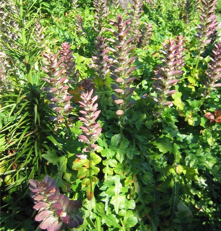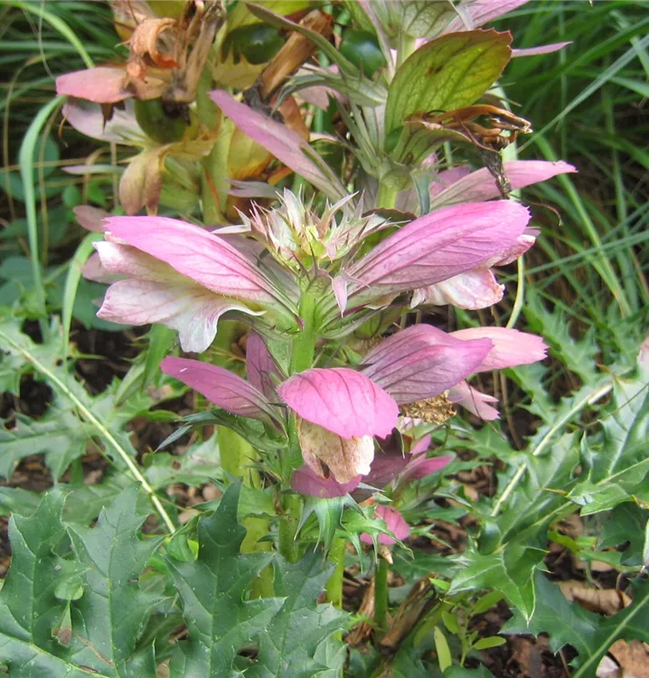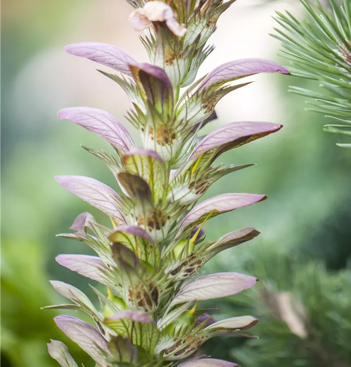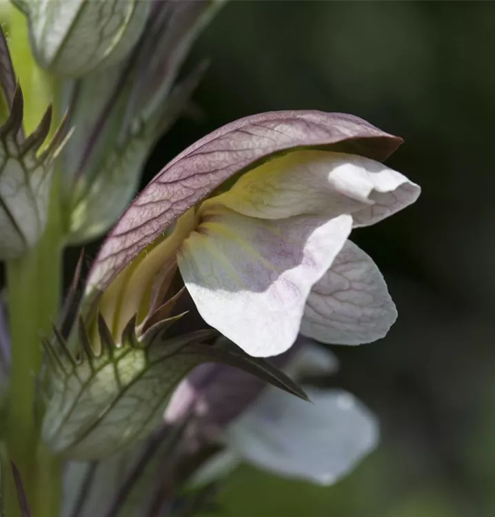Die 60-75 cm langen, ährigen Blütenstände erscheinen im Juli und August. Die etwa 5 cm großen Einzelblütem sind weiß bis zart rosafarben und sitzen zwischen purpurfarbenen, bedornten Hochblättern. Nur kräftige Insekten wie Hummeln und Holzbienen, die die Blütenblätter mit ihrem Gewicht öffnen können, gelangen an den Nektar und Pollen.