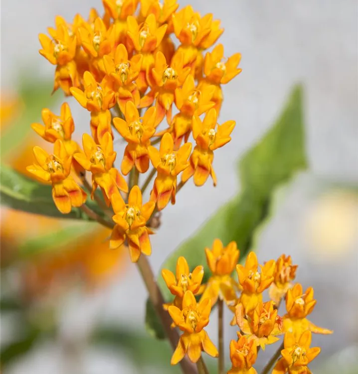 Asclepias tuberosa bildet sternförmige, in Dolden angeordnete, orangefarbene Blüten ab Juni. Diese verströmen einen angenehmen Duft.