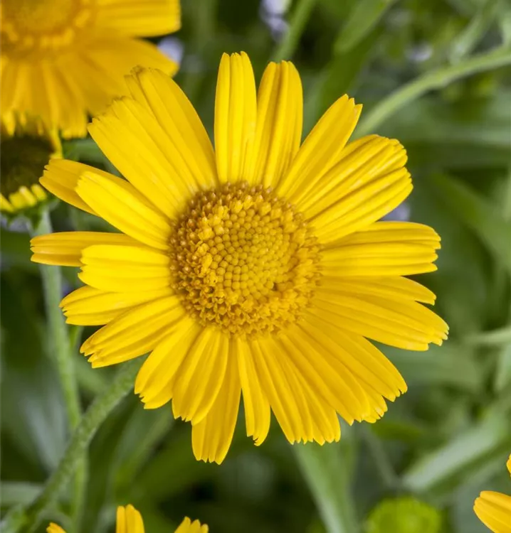 Buphthalmum salicifolium bildet körbchenartige, goldgelbe Blüten ab Juli.