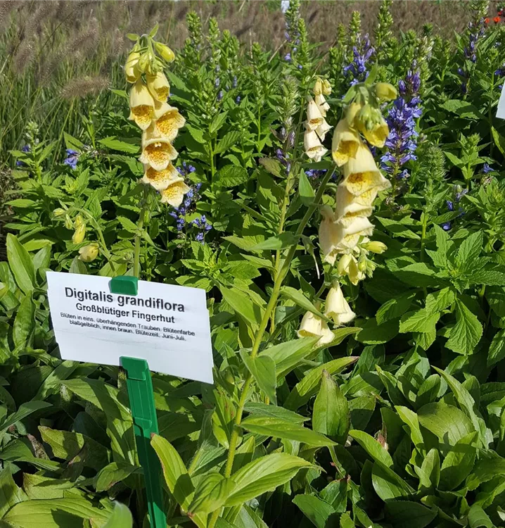 Der Großblütige Fingerhut (Digitalis grandiflora) ist eine aufrechte wintergrüne Staude, die von Juni bis August hellgelbe, glockenförmige Blüten bildet. An einem sonnigen Standort mit durchlässigem Boden erreicht er gewöhnlich eine Höhe von ca. 80 cm und wird ca. 40 cm breit. Der Großblütige Fingerhut ist gut frostverträglich.