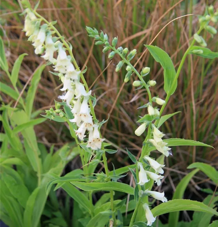 Der Gelbblühende Fingerhut (Digitalis lutea) ist eine aufrechte wintergrüne Staude, die von Juni bis August hellgelbe, glockenförmige Blüten bildet. An einem sonnigen bis halbschattigen Standort mit durchlässigem, kalkhaltigem, lehmigem Boden erreicht er gewöhnlich eine Höhe von ca. 1 m und wird ca. 40 cm breit. Der Gelbblühende Fingerhut ist gut frostverträglich.