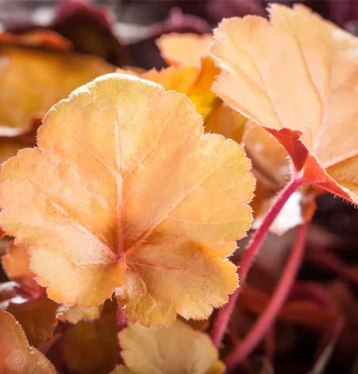 Das Garten-Silberglöckchen 'Peach Flambe' (Heuchera micrantha) ist eine buschige, rhizombildende, rosettenartige wintergrüne Staude mit dekorativen, rundlichen, orangefarbenen Blättern. An einem sonnigen bis halbschattigen Standort mit durchlässigem, nährstoffreichem Boden erreicht es gewöhnlich eine Höhe von ca. 50 cm und wird ca. 40 cm breit. Das Garten-Silberglöckchen 'Peach Flambe' ist gut frostverträglich.
