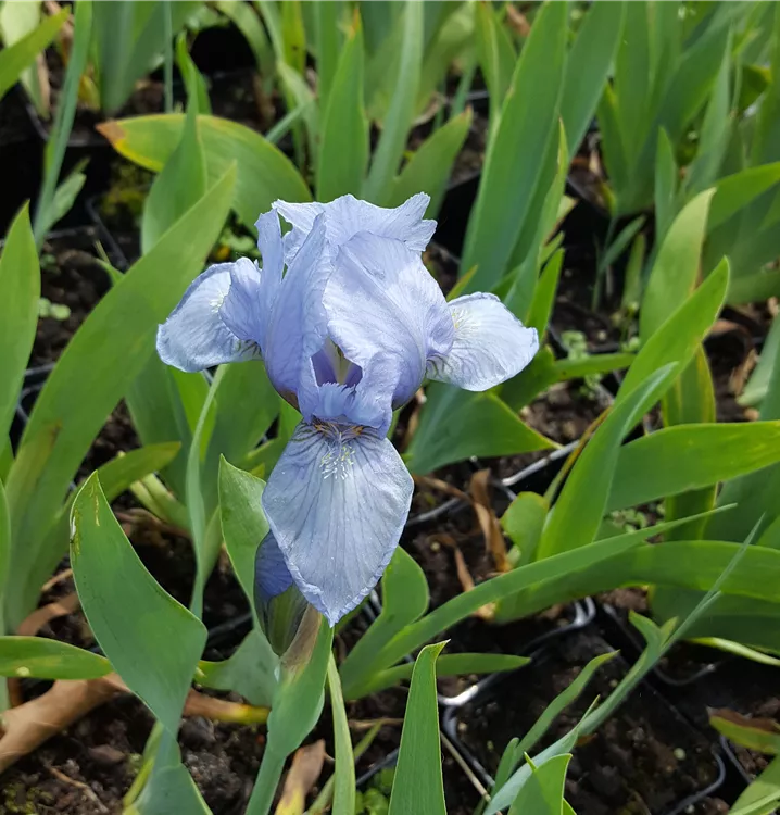 Die Zwerg-Iris 'Blue Denim' (Iris x barbata-nana 'Blue Denim') blüht von April bis Mai. Die Blüten sind hellviolettblau mit dunklerer Aderung und weißem Bart. Wird bis zu 35 cm hoch. Züchter: Warburton, 1959
