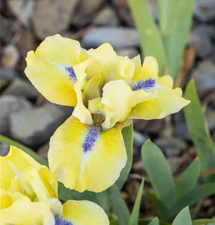Die Zwerg-Iris 'Stockholm' (Iris x barb.-nana 'Stockholm') blüht von April bis Mai. Die Blüten sind hellgelb mit auffällig kontrastierendem violettem Bart. Wird 20-30 cm hoch.