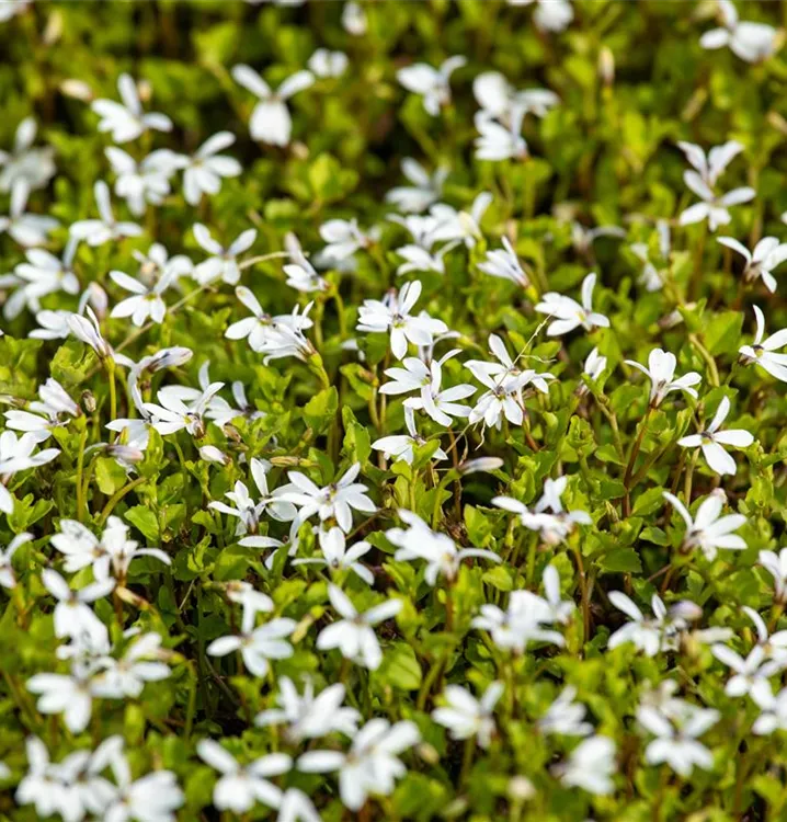 Pratia pedunculata 'Alba' bildet sternförmige, weiße Blüten ab Mai.