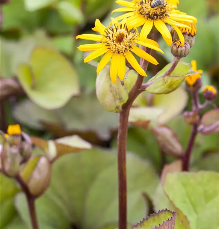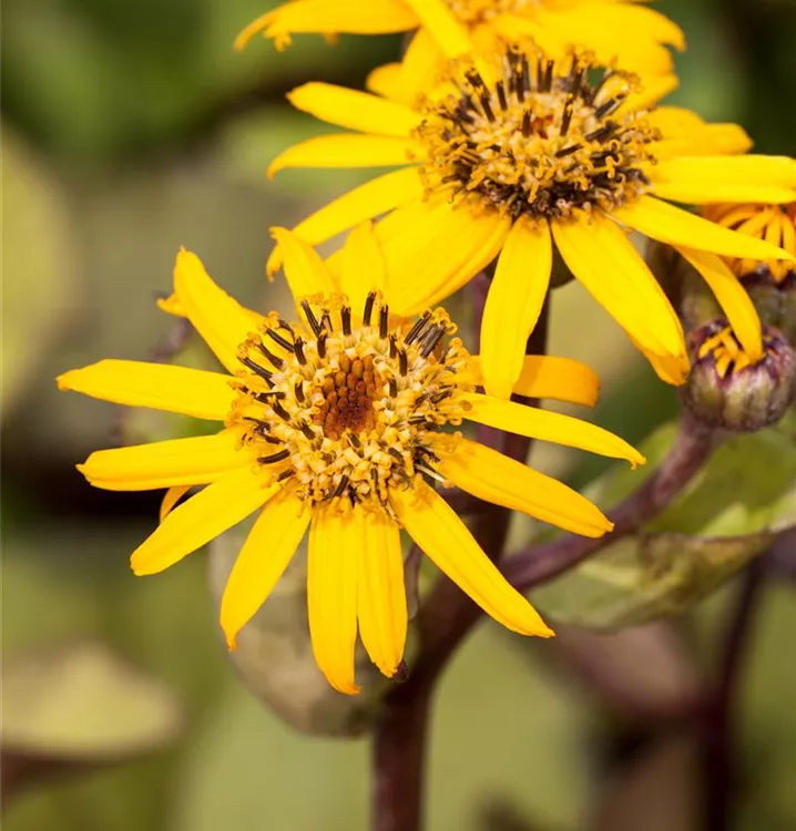 Ligularia dentata bildet körbchenartige, in Dolden angeordnete, goldgelbe Blüten ab August.