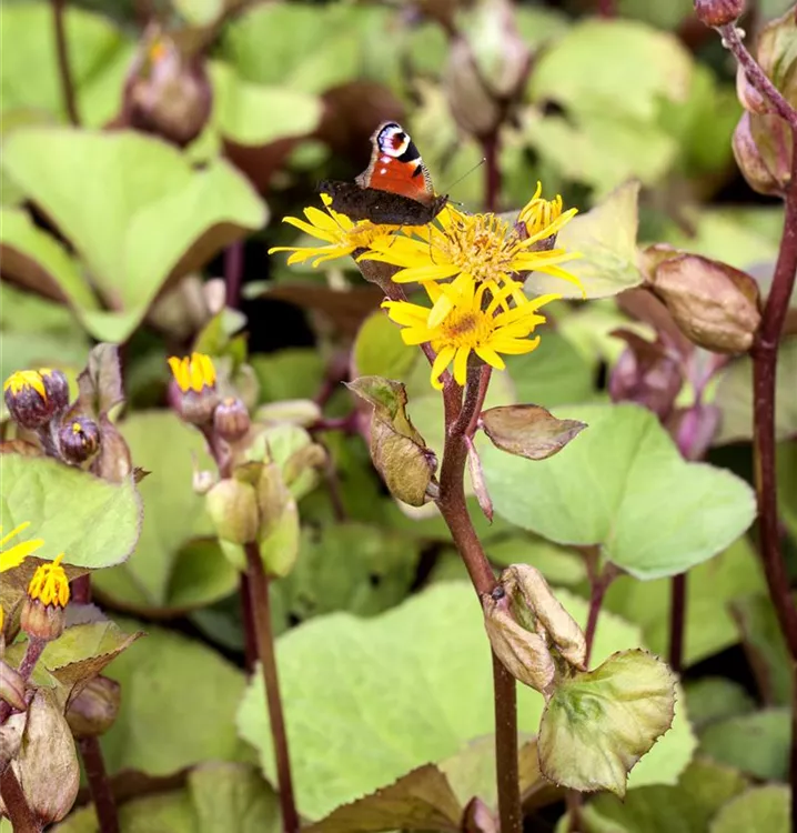 Der Strauß-Goldkolben (Ligularia dentata) ist eine buschige, aufrechte Staude, die von August bis September goldgelbe, körbchenartige, in Dolden angeordnete Blüten bildet. An einem sonnigen bis halbschattigen Standort mit durchlässigem, humosem Boden erreicht er gewöhnlich eine Höhe von ca. 1,2 m und wird ca. 80 cm breit. Der Strauß-Goldkolben ist gut frostverträglich.