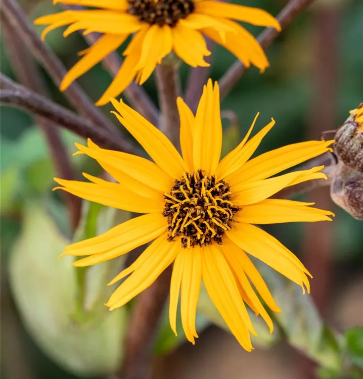 Ligularia dentata 'Othello' bildet körbchenartige, in Dolden angeordnete, goldgelbe Blüten ab August.