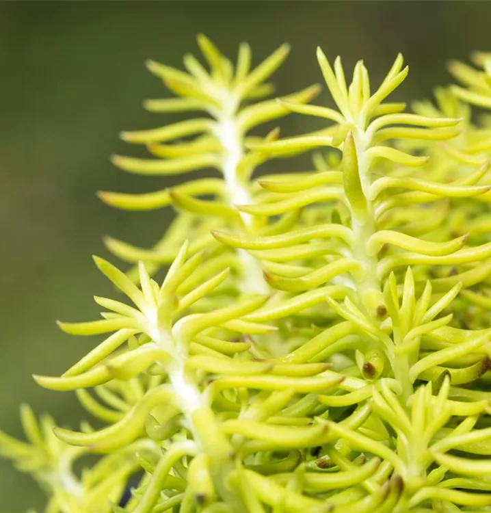 Die Tripmadam (Sedum reflexum) ist eine wintergrüne Staude, die von Juli bis August gelbe, in Dolden angeordnete Blüten bildet.
