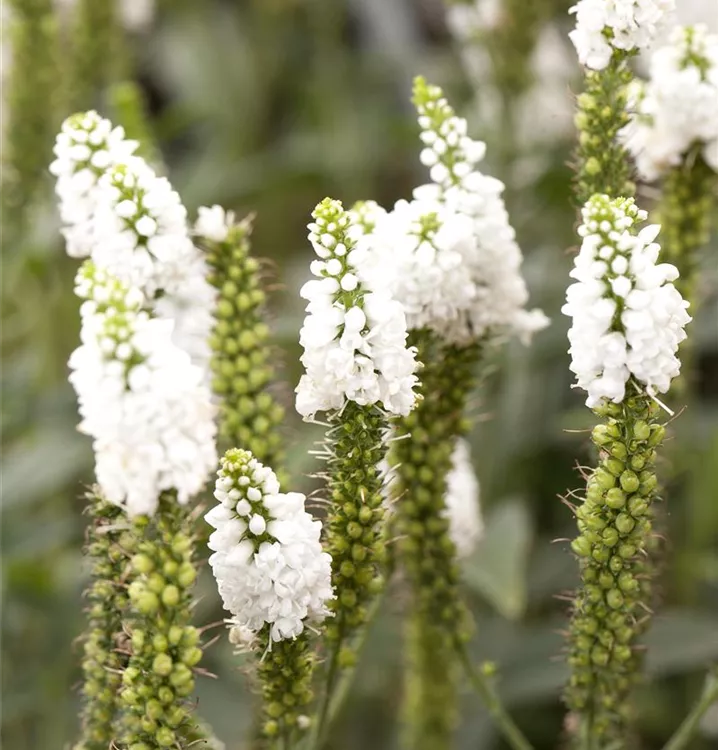 Der Langblättrige Garten-Ehrenpreis 'Schneeriesin' (Veronica longifolia 'Schneeriesin') bildet weiße, ansehnliche Blüten von Juli bis August. Die Blüten sind rachenförmig.