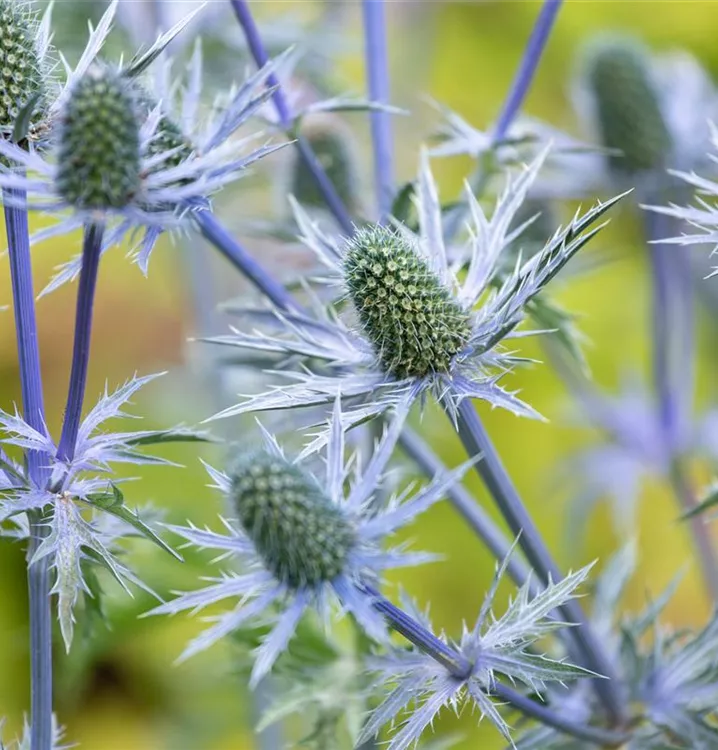 Eryngium giganteum bildet in Kolben angeordnete, silberweiße Blüten ab Juli.