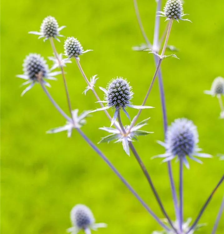 Eryngium planum 'Blaukappe' bildet dunkelblaue Blüten ab Juli.