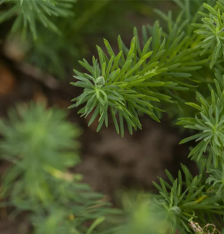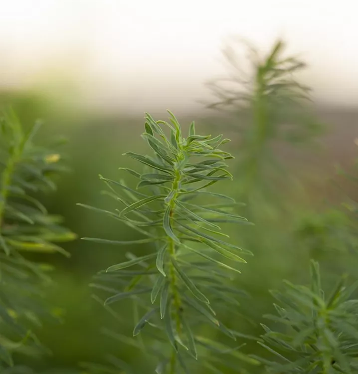 Die sommergrünen Blätter der Zypressen-Wolfsmilch sind mittelgrün, nadelförmig.