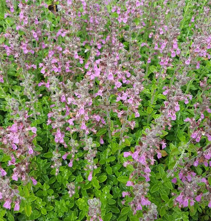Der Rosa Edel-Gamander (Teucrium chamaedrys) ist eine buschige Staude, die von Juli bis August rosafarbene, lippenförmige Blüten bildet. An einem sonnigen Standort mit durchlässigem, kalkhaltigem Boden erreicht er gewöhnlich eine Höhe von ca. 40 cm und wird ca. 25 cm breit. Der Rosa Edel-Gamander ist gut frostverträglich.