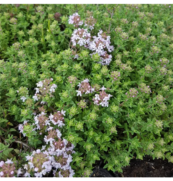 Der Gedrungene Thymian 'Compactus' (Thymus vulgaris 'Compactus') ist eine kompakt bleibende Auslese mit kugeligem Wuchs, die nur etwa 20 cm hoch wird. Ansonsten wie die Art.