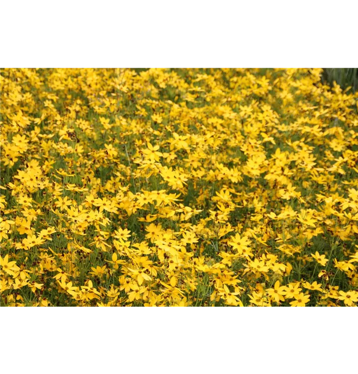 Das Mädchenauge 'Grandiflora' (Coreopsis verticillata) ist eine buschige, ausläuferbildende Staude, die von Juni bis August gelbe, strahlenförmige Blüten bildet. An einem sonnigen Standort mit durchlässigem Boden erreicht es gewöhnlich eine Höhe von ca. 60 cm und wird ca. 40 cm breit. Das Mädchenauge 'Grandiflora' ist gut frostverträglich.