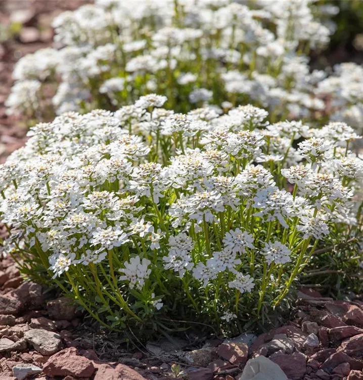 Die Immergrüne Garten-Schleifenblume 'Alexander's White' (Iberis sempervirens) ist eine flache, polsterbildende wintergrüne Staude, die von März bis Juni weiße, in Dolden angeordnete Blüten bildet. An einem sonnigen Standort mit durchlässigem, nährstoffreichem Boden erreicht sie gewöhnlich eine Höhe von ca. 25 cm und wird ca. 60 cm breit. Die Immergrüne Garten-Schleifenblume 'Alexander's White' ist gut frostverträglich.