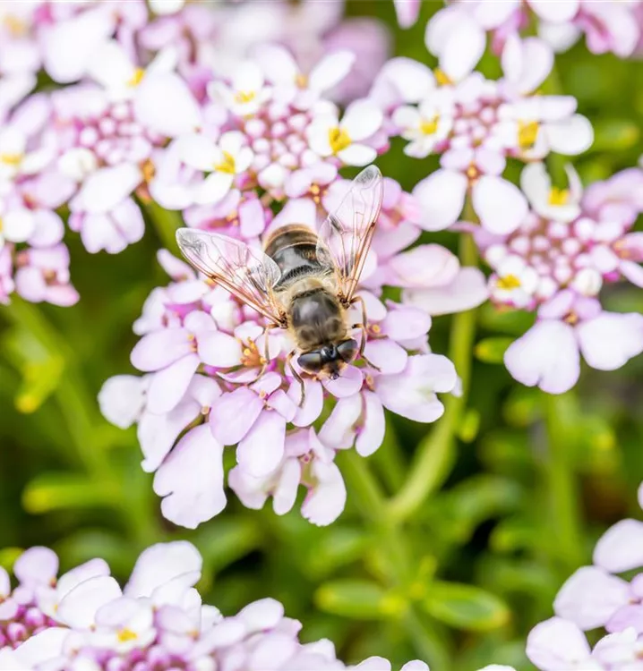 Die Immergrüne Schleifenblume 'Pink Ice®' (Iberis sempervirens) ist eine flache, polsterbildende immergrüne Staude, die von April bis Mai rosafarbene, in Dolden angeordnete Blüten bildet. An einem sonnigen Standort mit durchlässigem, nährstoffreichem Boden erreicht sie gewöhnlich eine Höhe von ca. 30 cm und wird ca. 40 cm breit. Die Immergrüne Schleifenblume 'Pink Ice®' ist gut frostverträglich.
