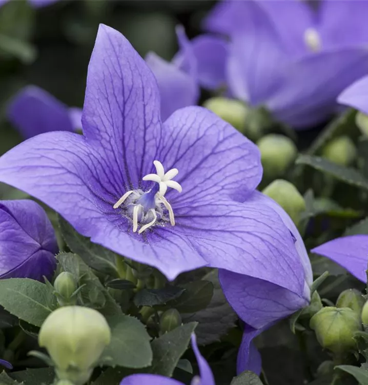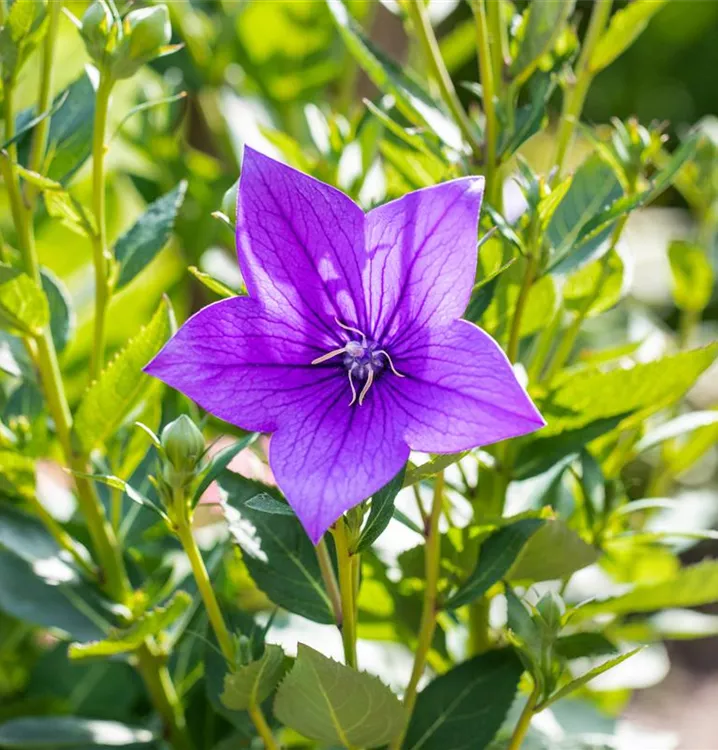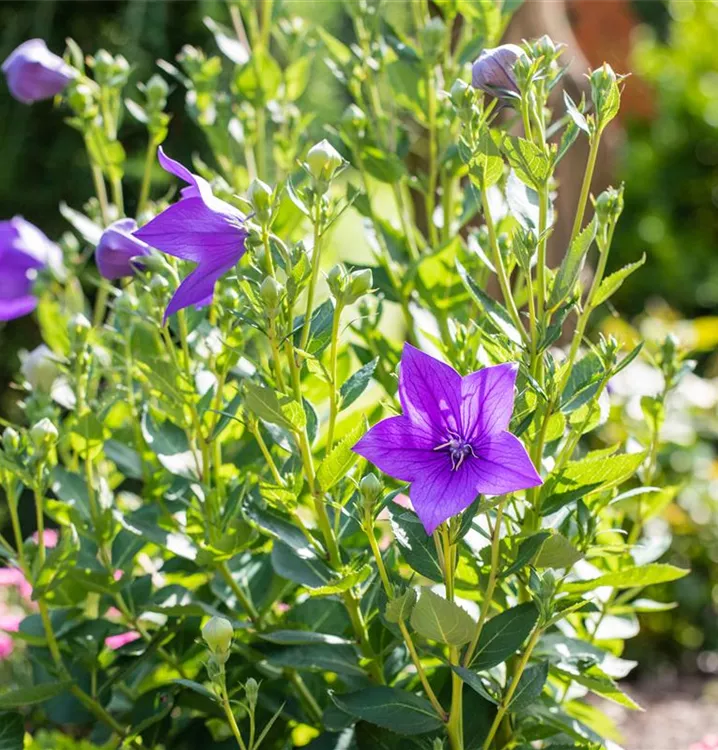 Platycodon grandiflorus 'Astra', blau bildet glockenförmige, blaue Blüten ab Juli.