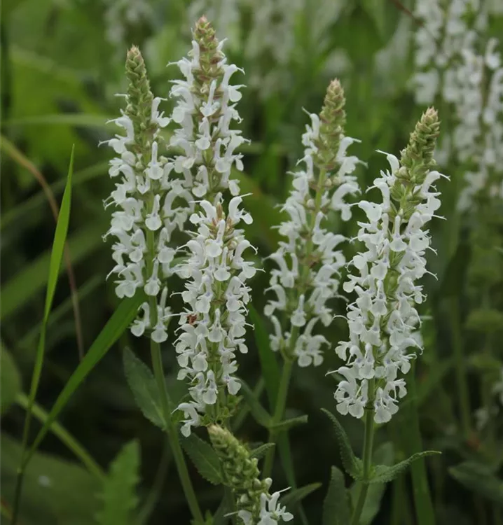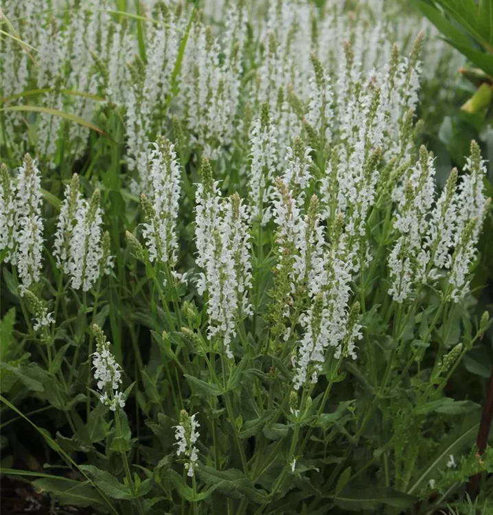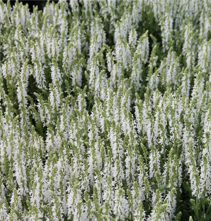 Die Sorte Salvia nemorosa 'Adrian' wächst aufrecht, breit und locker. Ihre reinweißen Blüten stehen in dichten Quirlen. Die Sorte erreicht etwa 45 cm Höhe bei einer Breite von ca. 35 cm.