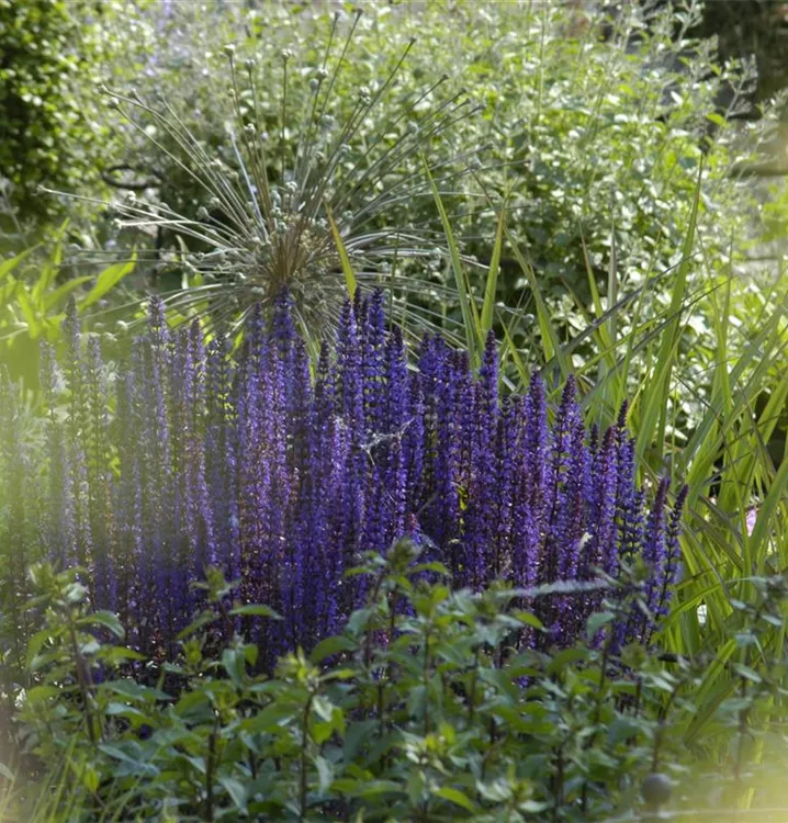 Der Steppen-Salbei 'Negrito' (Salvia nemorosa 'Negrito') wächst straff aufrecht und hat schmale, violett blühende Blütenähren. Wird bis zu 50 cm hoch und 40 cm breit.