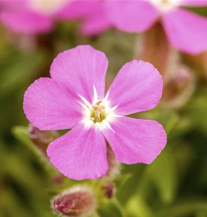 Das Kissen-Seifenkraut (Saponaria ocymoides) ist eine kissenförmige Staude, die von Mai bis Juli rosafarbene, sternförmige, in Dolden angeordnete Blüten bildet. An einem sonnigen Standort mit durchlässigem, kalkhaltigem Boden erreicht es gewöhnlich eine Höhe von ca. 15 cm und wird ca. 30 cm breit. Das Kissen-Seifenkraut ist gut frostverträglich.