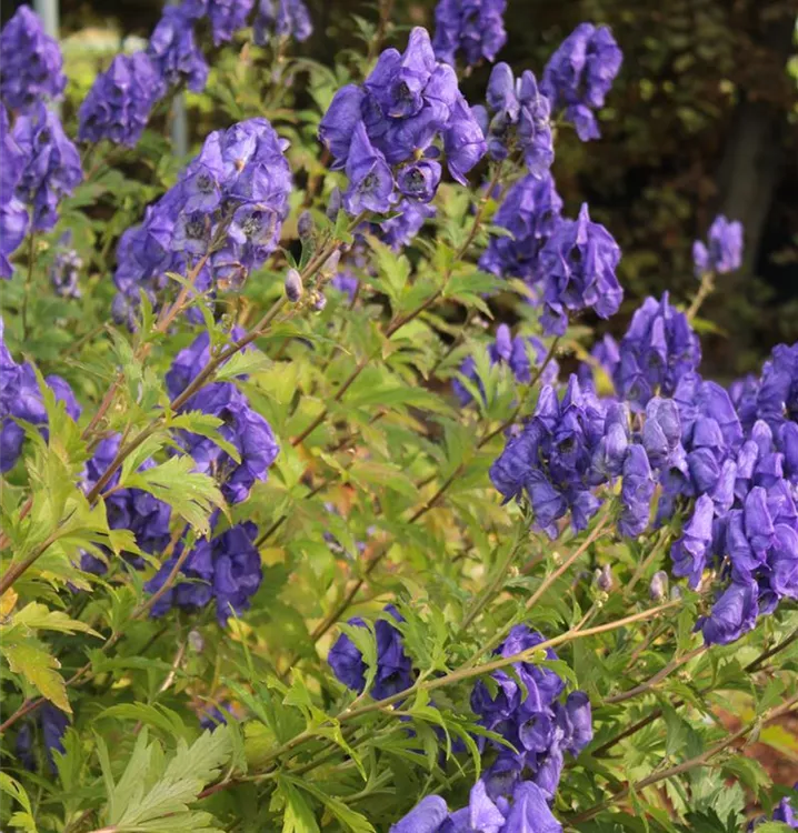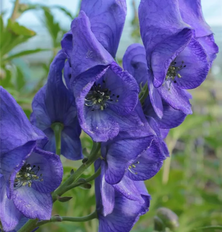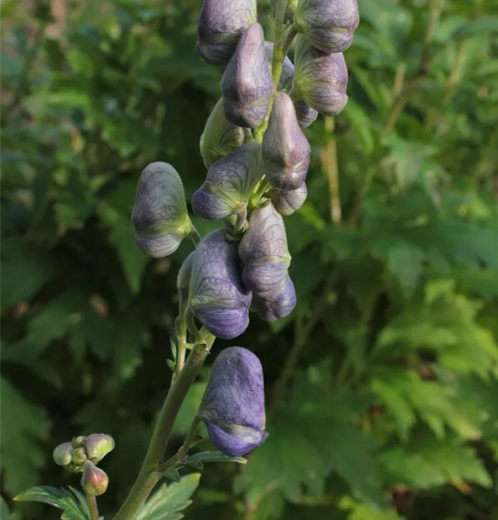 Die Knospen erinnern ein wenig an den Xenomorph, bevor sich die charakteristischen blauvioletten, helmförmigen Blüten öffnen, die dem deutschen Trivialnamen "Eisenhut" ihren Ursprung geben.